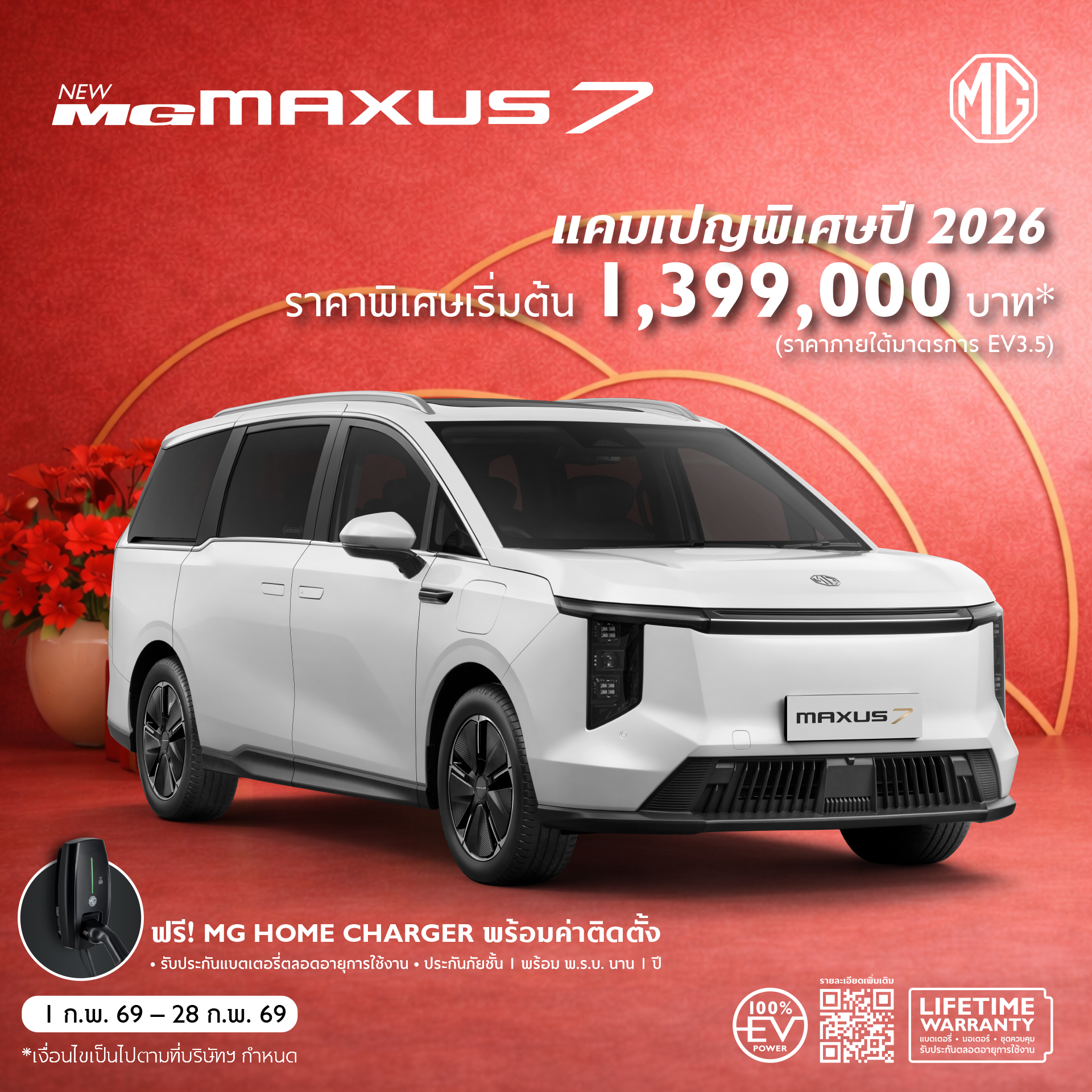 - เงื่อนไขทั้งหมดสำหรับลูกค้าที่จอง และรับรถกับผู้จำหน่ายรถยนต์เอ็มจีทุกแห่งทั่วประเทศ ตั้งแต่วันที่ 1 กุมภาพันธ์ 2569 ถึง 28 กุมภาพันธ์ 2569